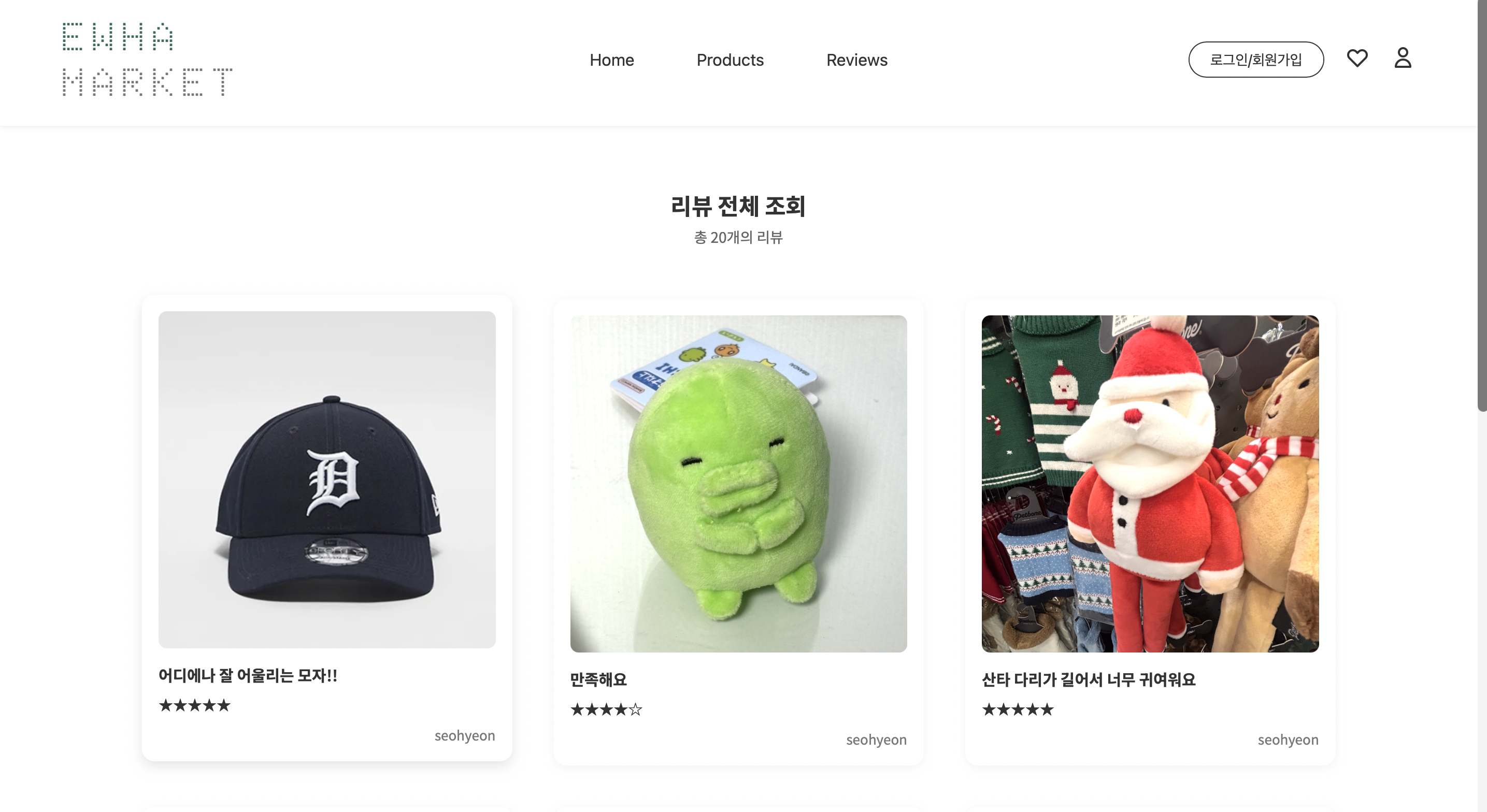 저희 조 오성그룹이 개발한 ‘이화 마켓’은 중고거래 플랫폼의 웹어플리케이션입니다. 이화마켓의 핵심 기능 중 하나는 바로 ‘리뷰 전체 조회’ 페이지인데요, 이 페이지에서 사용자들은 많은 후기들을 쉽고 편하게 볼 수 있습니다. 이번 포스팅에서는 이 많은 정보들을 직관적이고 깔끔하게 정리하여 탐색 경험을 최적화한 프론트엔드 구현 과정을 설명하고자 합니다.